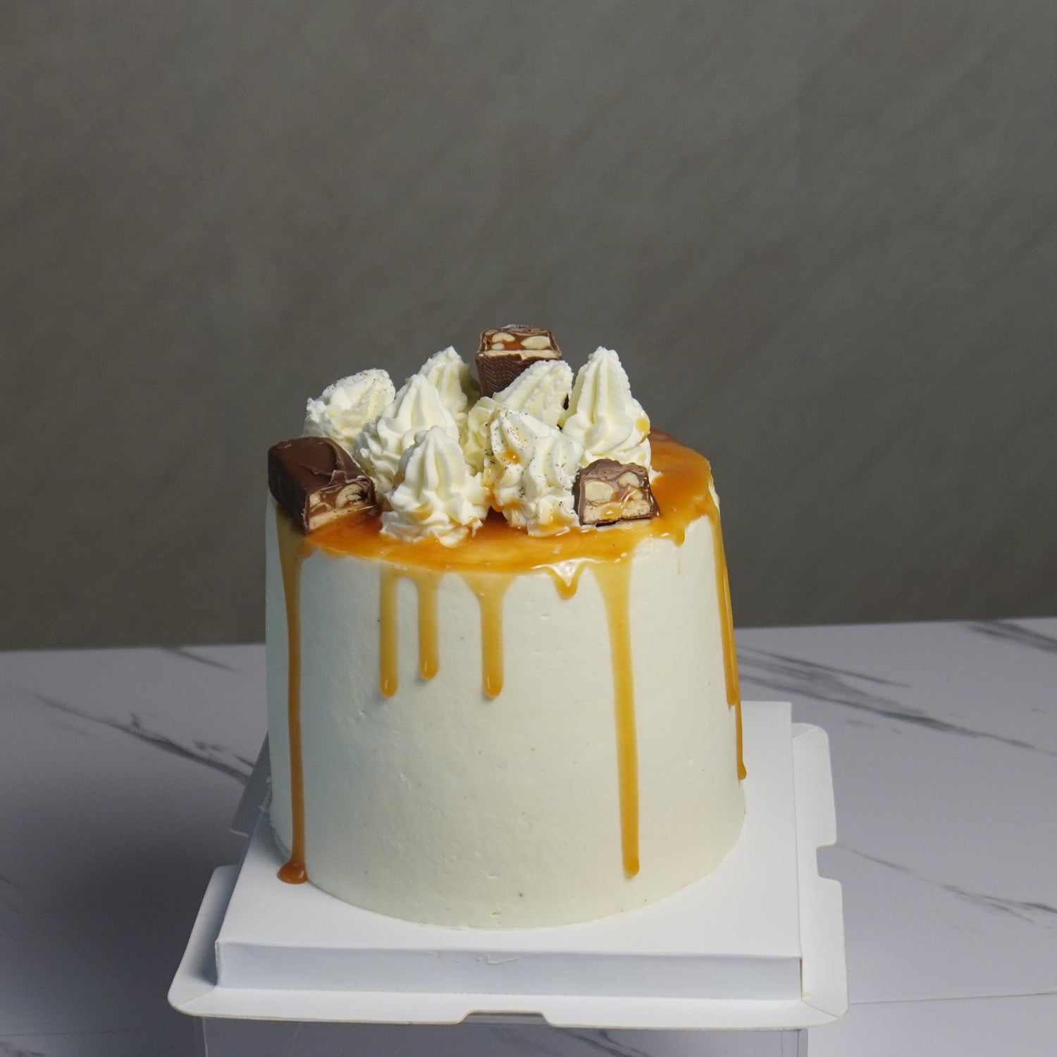 A 5" boutique-size cake, perfect for about 6 servings – ideal for caramel, peanut and chocolate lovers.