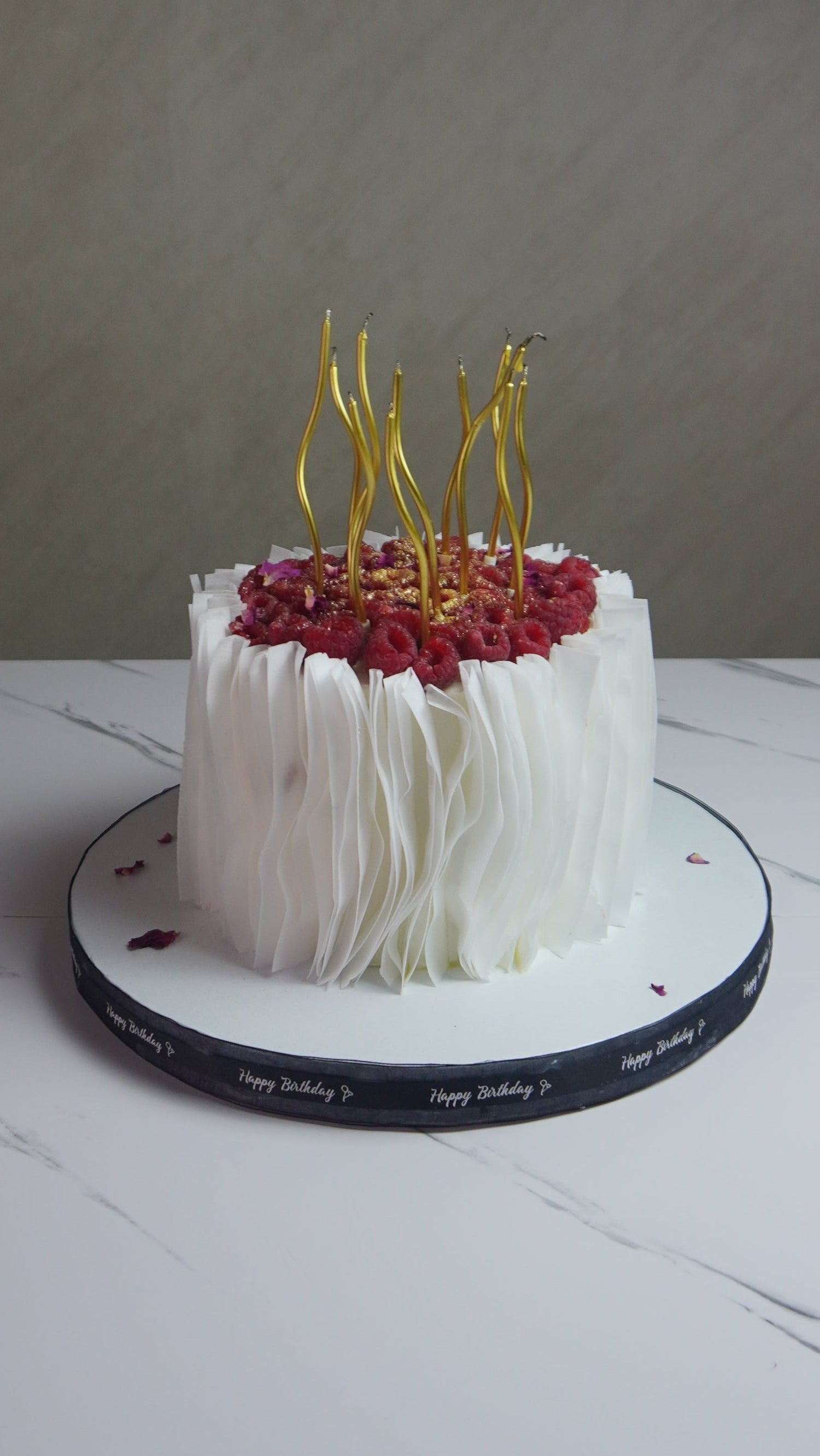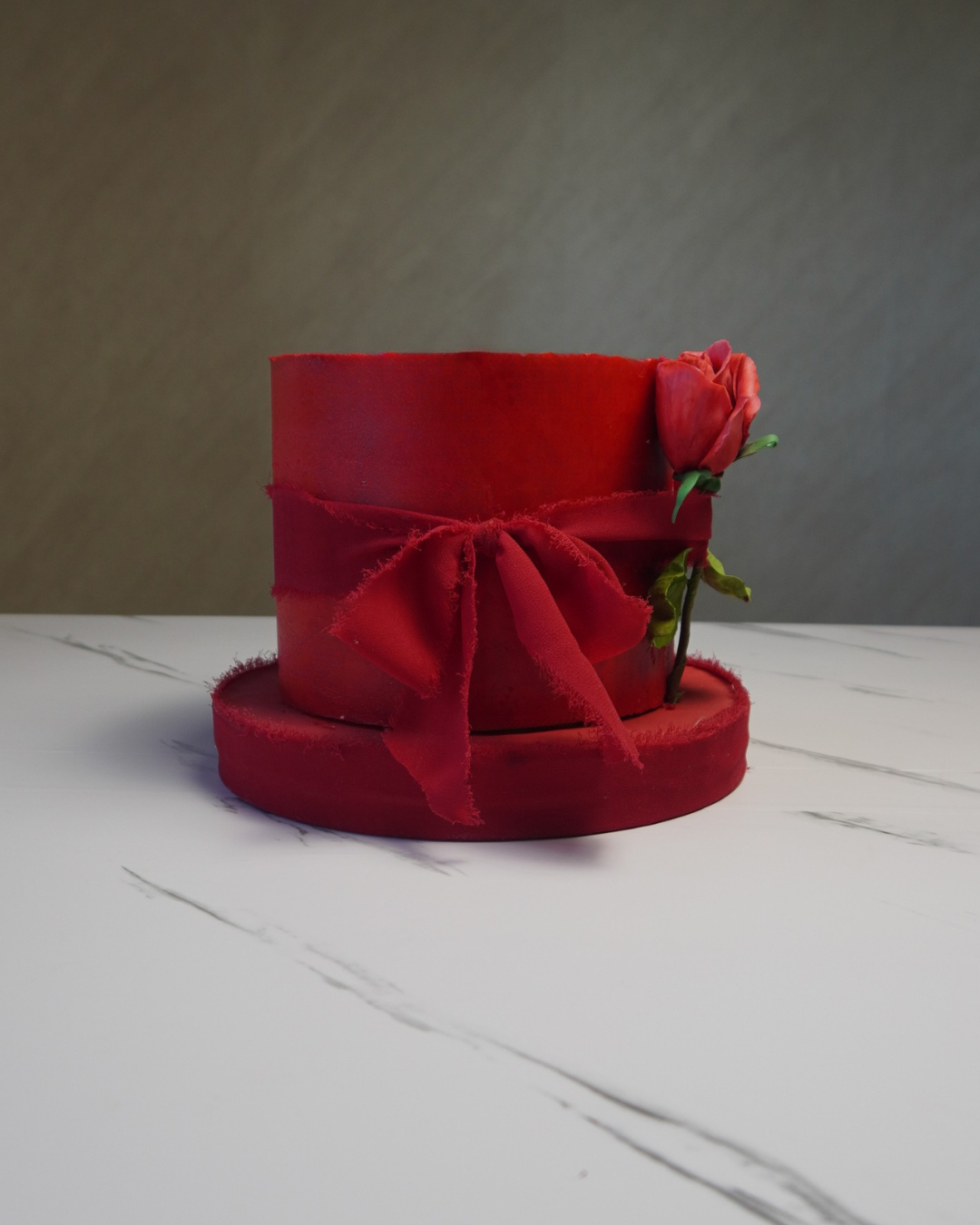 Bold romance in a tall, luxury finish. This 6” x 5” cake features delicate almond Joconde, a jewel-like strawberry confit infused with blossom water, lychee & lime gelée, and a silky champagne–vanilla white chocolate mousse. Finished in champagne Swiss meringue buttercream and crowned with a 100% edible rose.