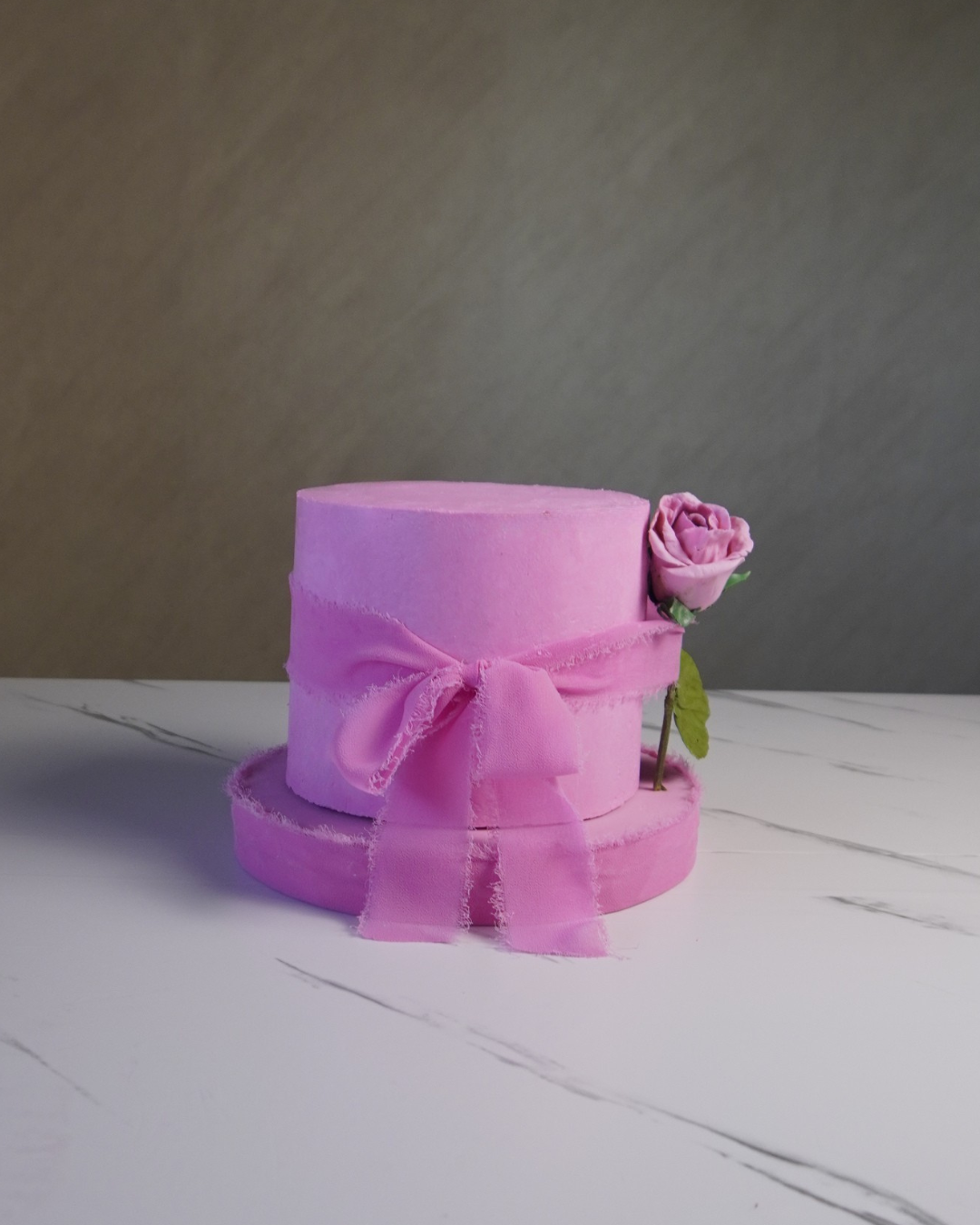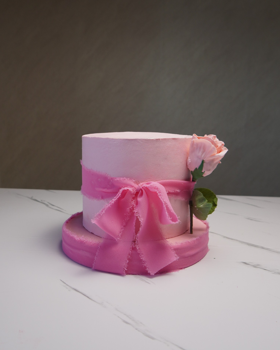 Soft, elegant, and timeless—quiet luxury in cake form. This tall 6” x 5” design layers almond Joconde, strawberry confit kissed with blossom water, lychee & lime gelée, and a silky champagne–vanilla white chocolate mousse. Finished with champagne Swiss meringue buttercream and topped with a 100% edible rose.